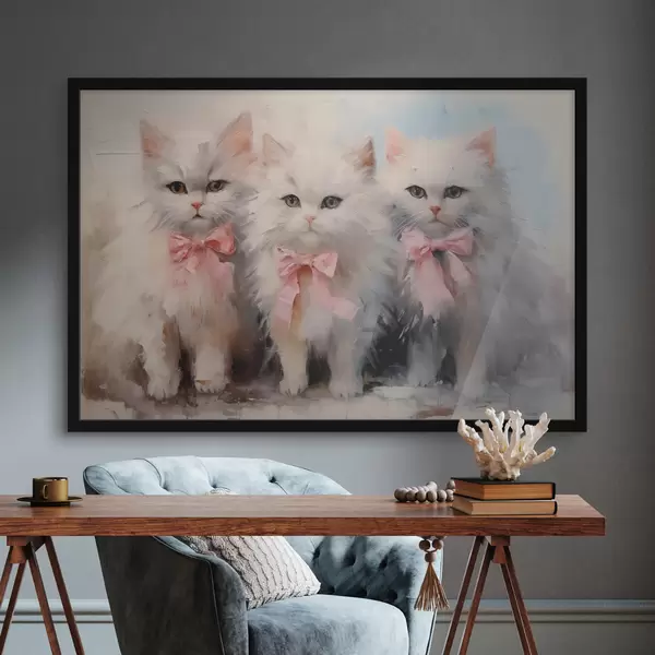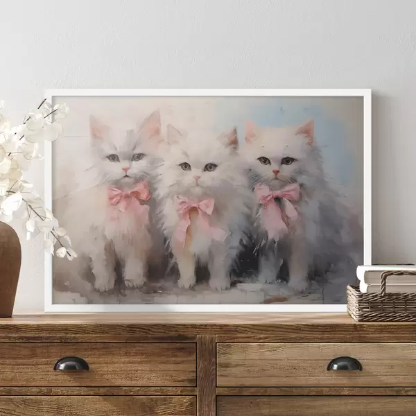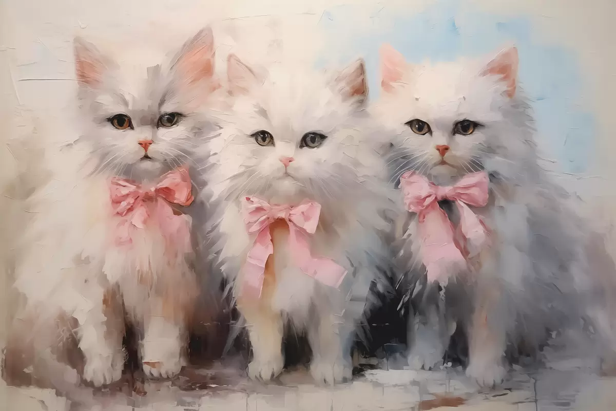 Poster Witte katten met roze strikken olieverfschilderij Nr f39826