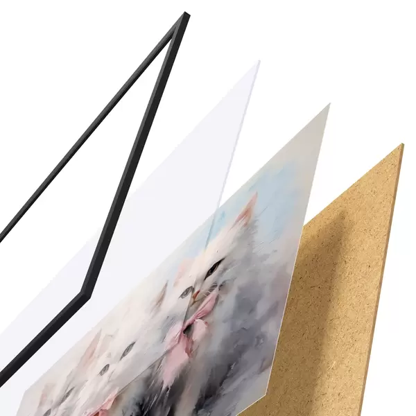 De poster bestaat uit een frame, plexiglas, geprinte afbeelding en spaanplaat achterkant. De poster kan meteen aan de muur worden gehangen dankzij de bevestigingen op de achterkant.