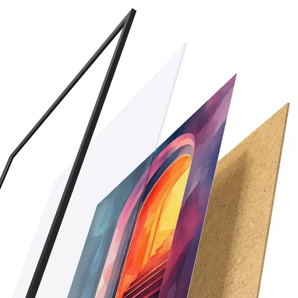 De poster bestaat uit een frame, plexiglas, geprinte afbeelding en spaanplaat achterkant. De poster kan meteen aan de muur worden gehangen dankzij de bevestigingen op de achterkant.