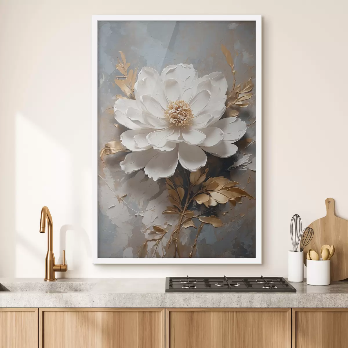 Poster Witte bloem met stengels op abstracte achtergrond Nr f39865