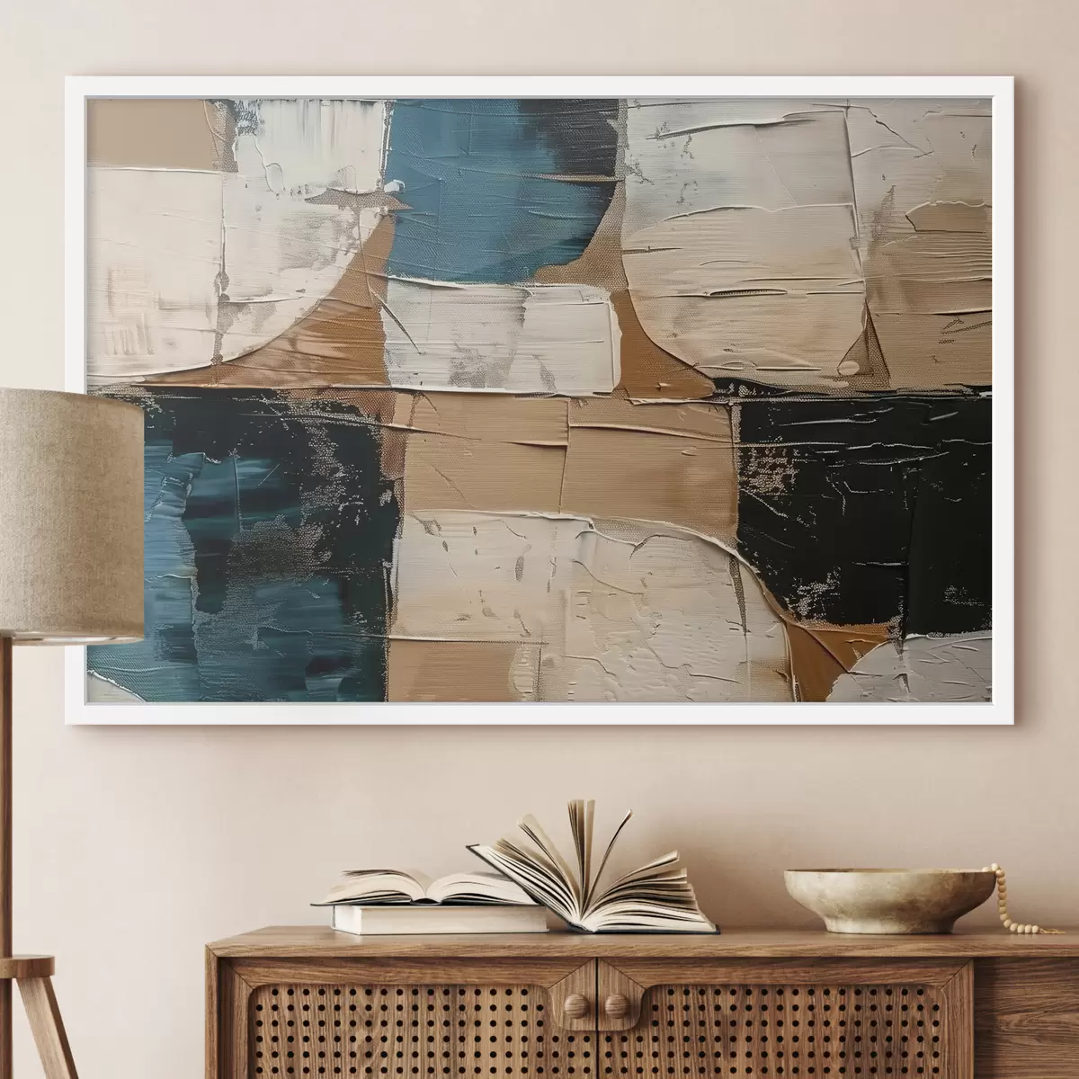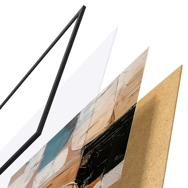 De poster bestaat uit een frame, plexiglas, geprinte afbeelding en spaanplaat achterkant. De poster kan meteen aan de muur worden gehangen dankzij de bevestigingen op de achterkant.