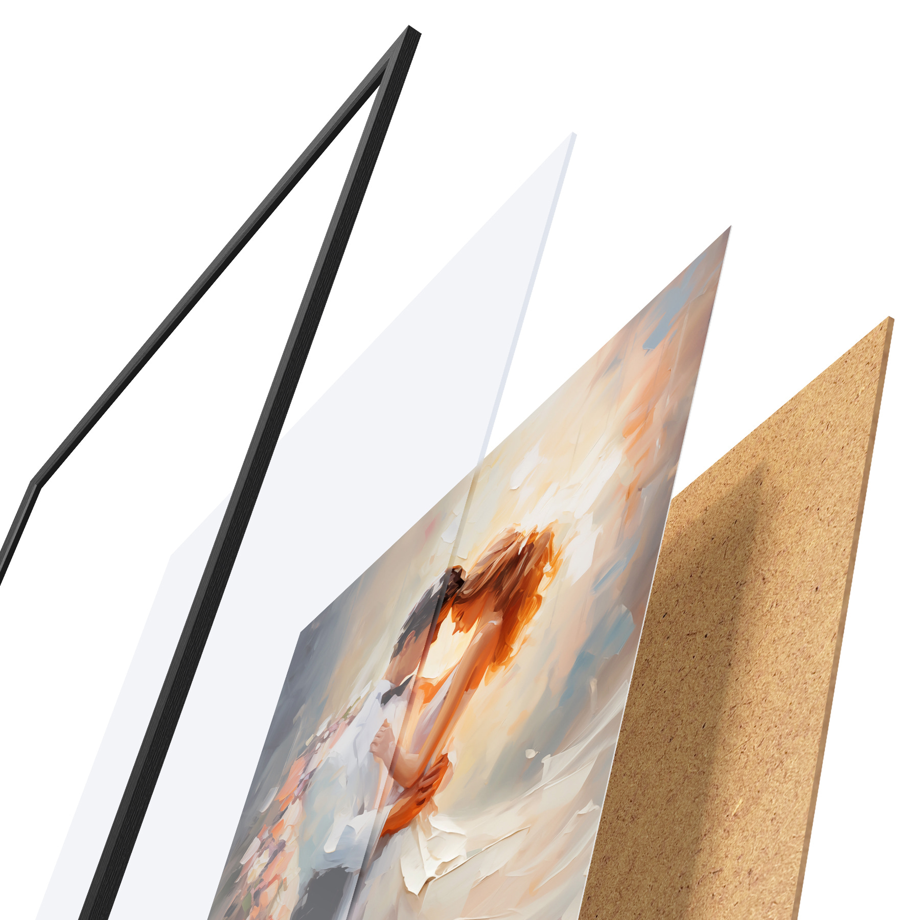 De poster bestaat uit een frame, plexiglas, geprinte afbeelding en spaanplaat achterkant. De poster kan meteen aan de muur worden gehangen dankzij de bevestigingen op de achterkant.