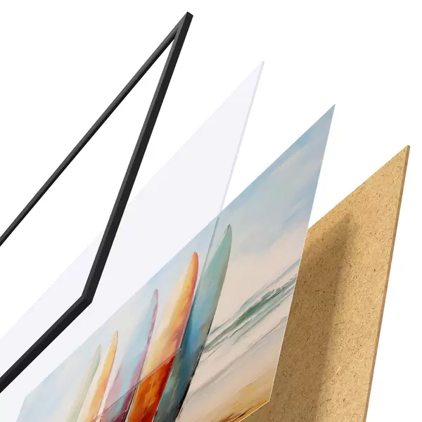 De poster bestaat uit een frame, plexiglas, geprinte afbeelding en spaanplaat achterkant. De poster kan meteen aan de muur worden gehangen dankzij de bevestigingen op de achterkant.