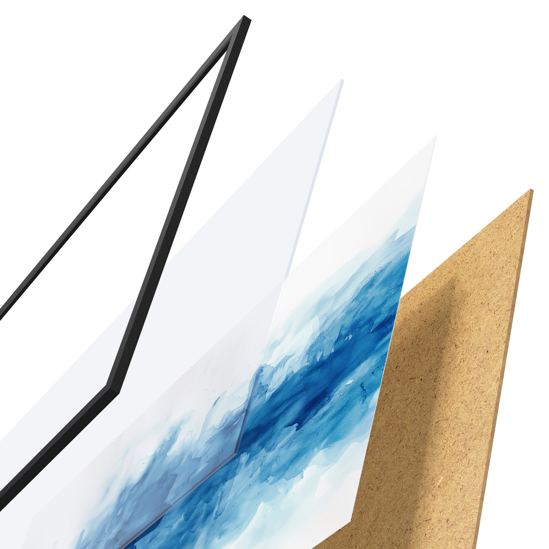 De poster bestaat uit een frame, plexiglas, geprinte afbeelding en spaanplaat achterkant. De poster kan meteen aan de muur worden gehangen dankzij de bevestigingen op de achterkant.