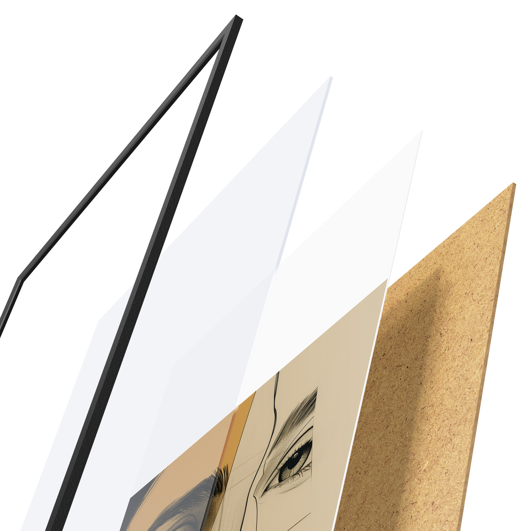 De poster bestaat uit een frame, plexiglas, geprinte afbeelding en spaanplaat achterkant. De poster kan meteen aan de muur worden gehangen dankzij de bevestigingen op de achterkant.