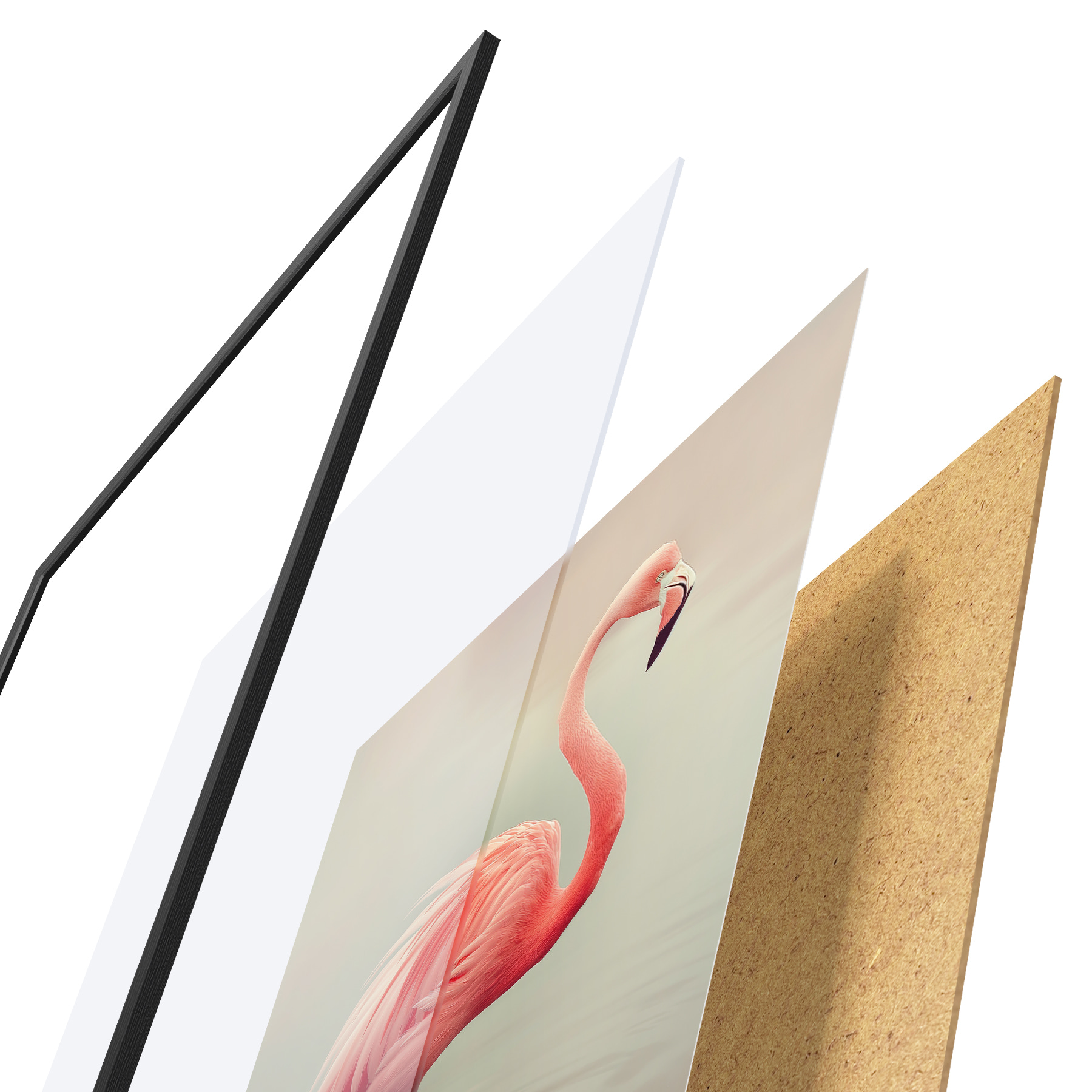 De poster bestaat uit een frame, plexiglas, geprinte afbeelding en spaanplaat achterkant. De poster kan meteen aan de muur worden gehangen dankzij de bevestigingen op de achterkant.