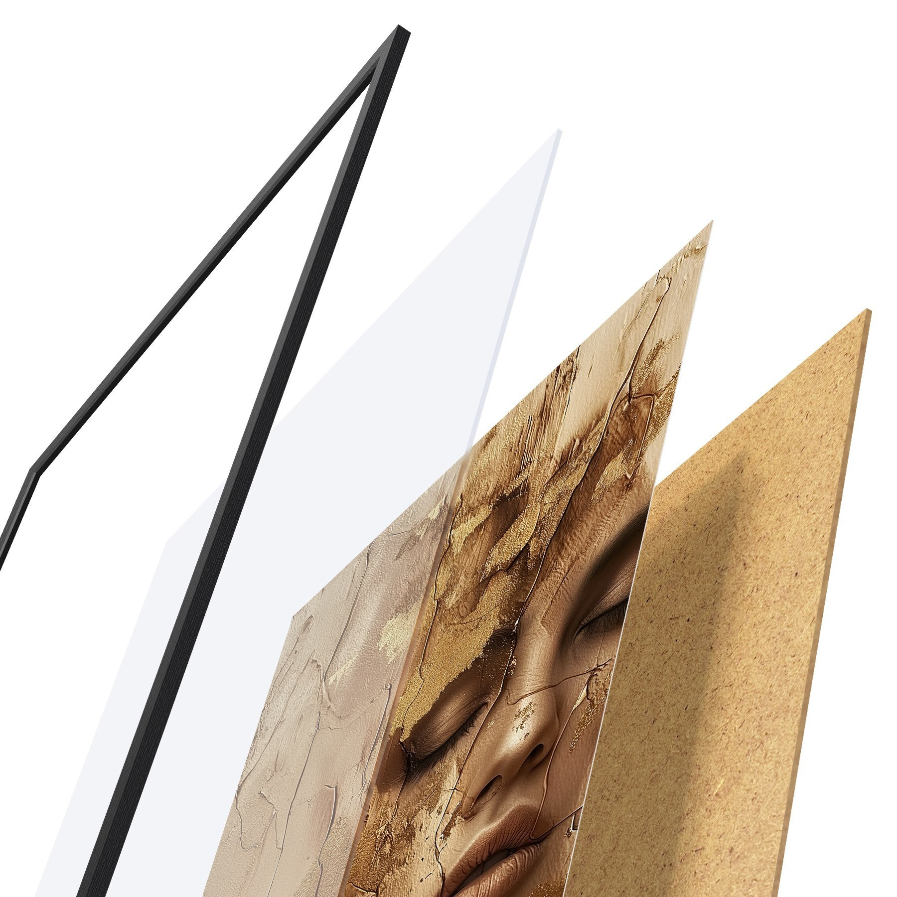 De poster bestaat uit een frame, plexiglas, geprinte afbeelding en spaanplaat achterkant. De poster kan meteen aan de muur worden gehangen dankzij de bevestigingen op de achterkant.