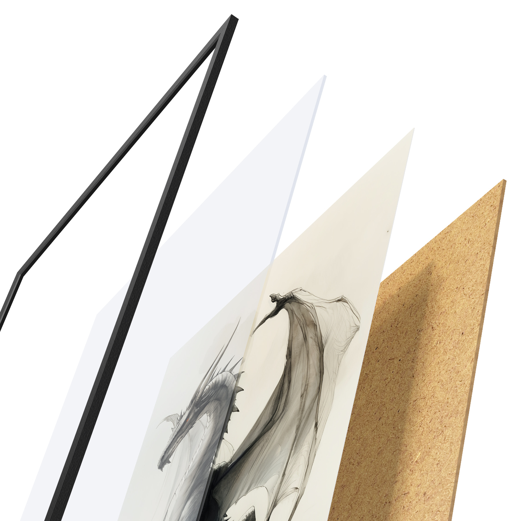 De poster bestaat uit een frame, plexiglas, geprinte afbeelding en spaanplaat achterkant. De poster kan meteen aan de muur worden gehangen dankzij de bevestigingen op de achterkant.