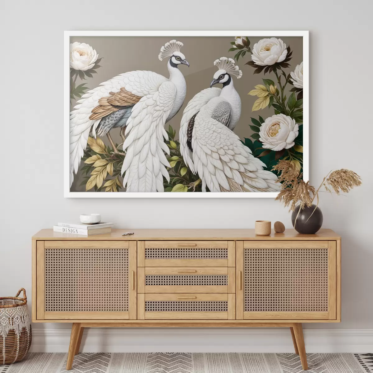 Poster Twee witte pauwen met sierlijke veren zitten op een tak met bloemen f40022