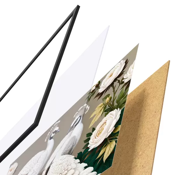 De poster bestaat uit een frame, plexiglas, geprinte afbeelding en spaanplaat achterkant. De poster kan meteen aan de muur worden gehangen dankzij de bevestigingen op de achterkant.