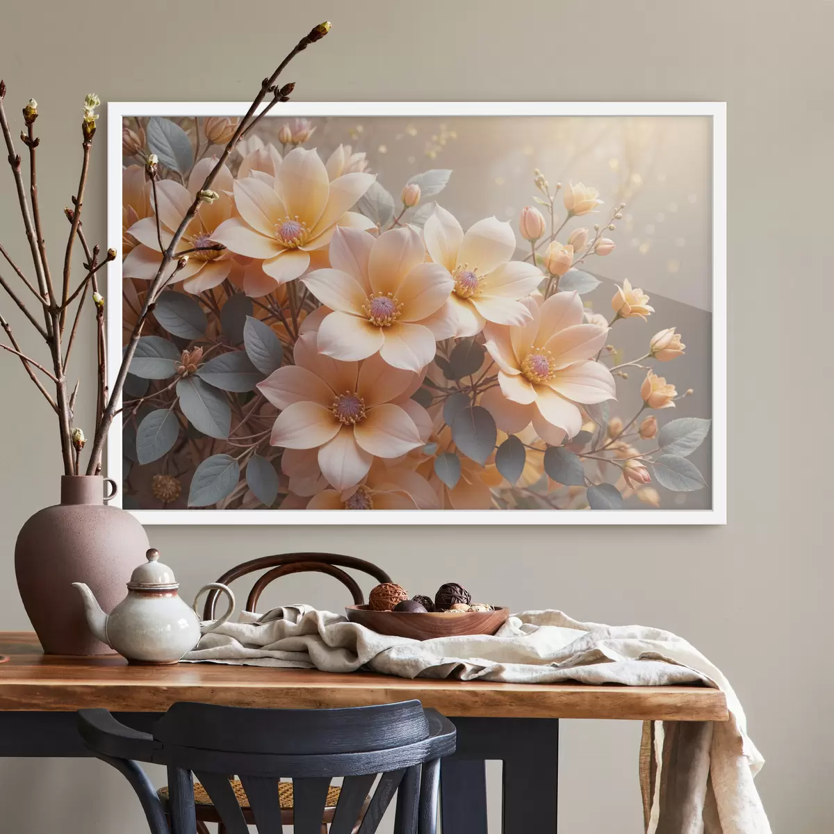 Poster Tedere perzikkleurige dahliabloemen in volle bloei, met zachte bloemblaadjes tegen een wazige achtergrond Nr f40024