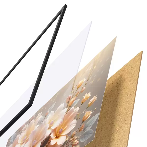 De poster bestaat uit een frame, plexiglas, geprinte afbeelding en spaanplaat achterkant. De poster kan meteen aan de muur worden gehangen dankzij de bevestigingen op de achterkant.