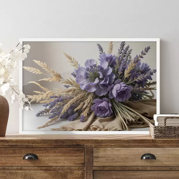 Poster Een boeket van paarse bloemen, waaronder pioenrozen en lavendel, met tarwestengels op een lichte achtergrond Nr f40030