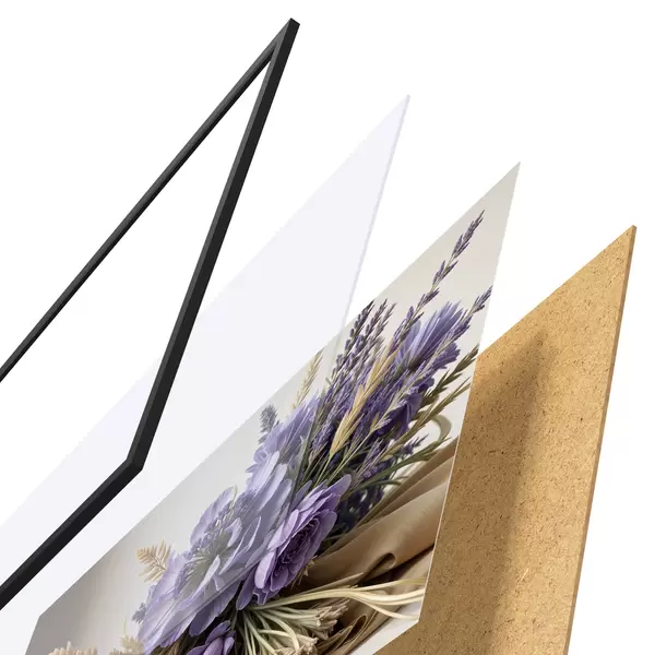 De poster bestaat uit een frame, plexiglas, geprinte afbeelding en spaanplaat achterkant. De poster kan meteen aan de muur worden gehangen dankzij de bevestigingen op de achterkant.