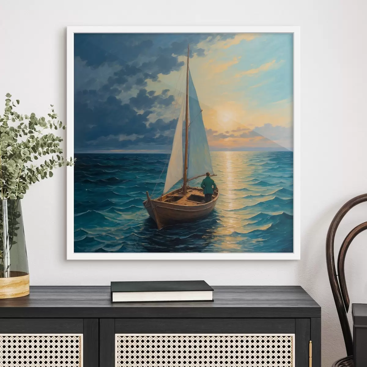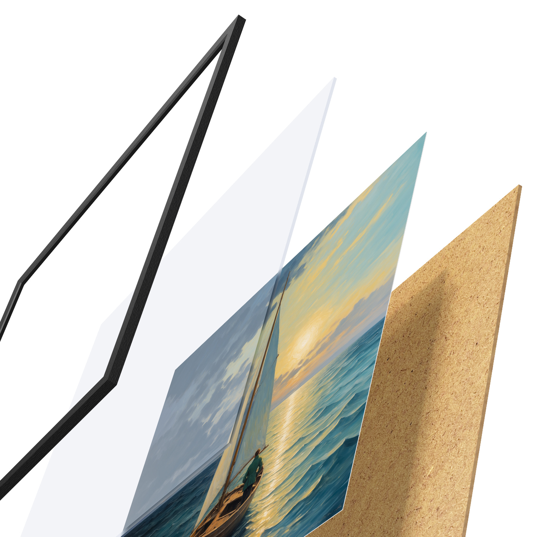 De poster bestaat uit een frame, plexiglas, geprinte afbeelding en spaanplaat achterkant. De poster kan meteen aan de muur worden gehangen dankzij de bevestigingen op de achterkant.