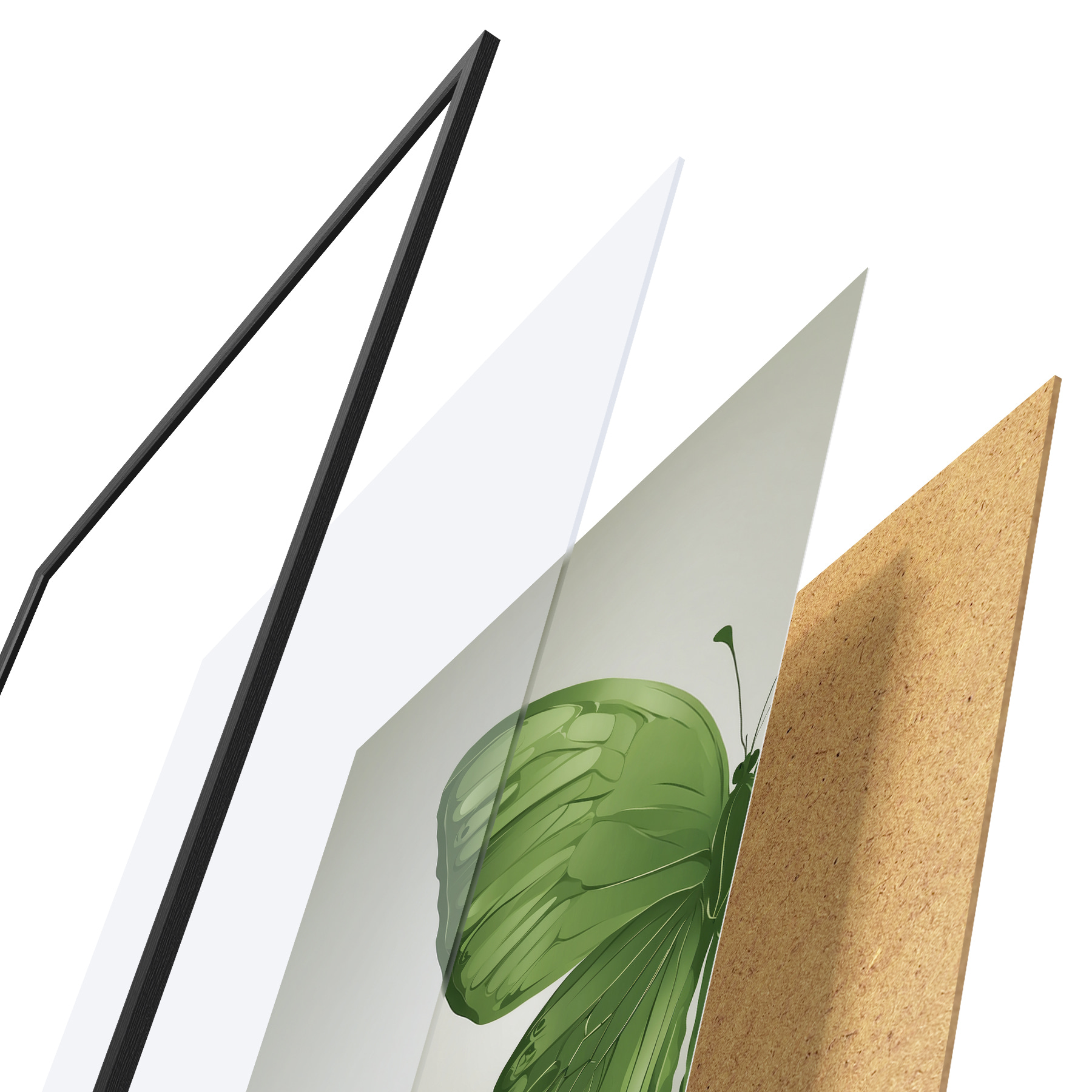 De poster bestaat uit een frame, plexiglas, geprinte afbeelding en spaanplaat achterkant. De poster kan meteen aan de muur worden gehangen dankzij de bevestigingen op de achterkant.
