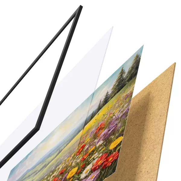 De poster bestaat uit een frame, plexiglas, geprinte afbeelding en spaanplaat achterkant. De poster kan meteen aan de muur worden gehangen dankzij de bevestigingen op de achterkant.
