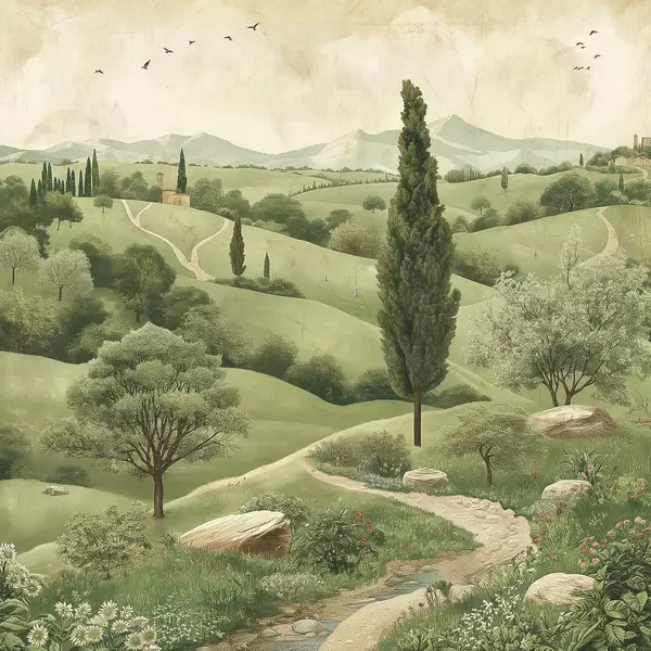 Poster Toscaans landschap, vintage stijl, pastelgroene kleuren, heuvels en bomen Nr f40075
