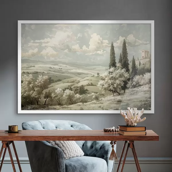 Poster Zomerlandschap, vintage stijl, pastelkleuren, acryl tekening, kasteel f40084