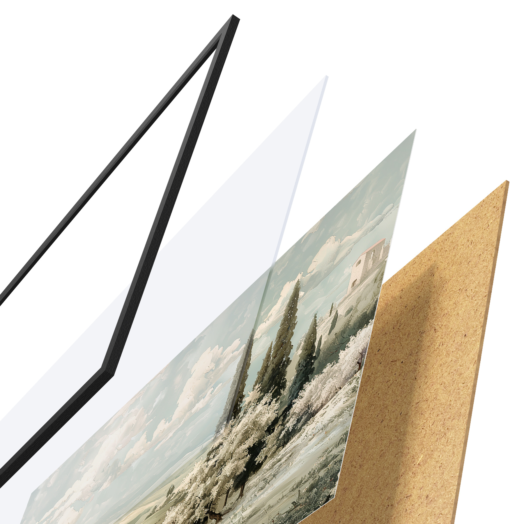 De poster bestaat uit een frame, plexiglas, geprinte afbeelding en spaanplaat achterkant. De poster kan meteen aan de muur worden gehangen dankzij de bevestigingen op de achterkant.
