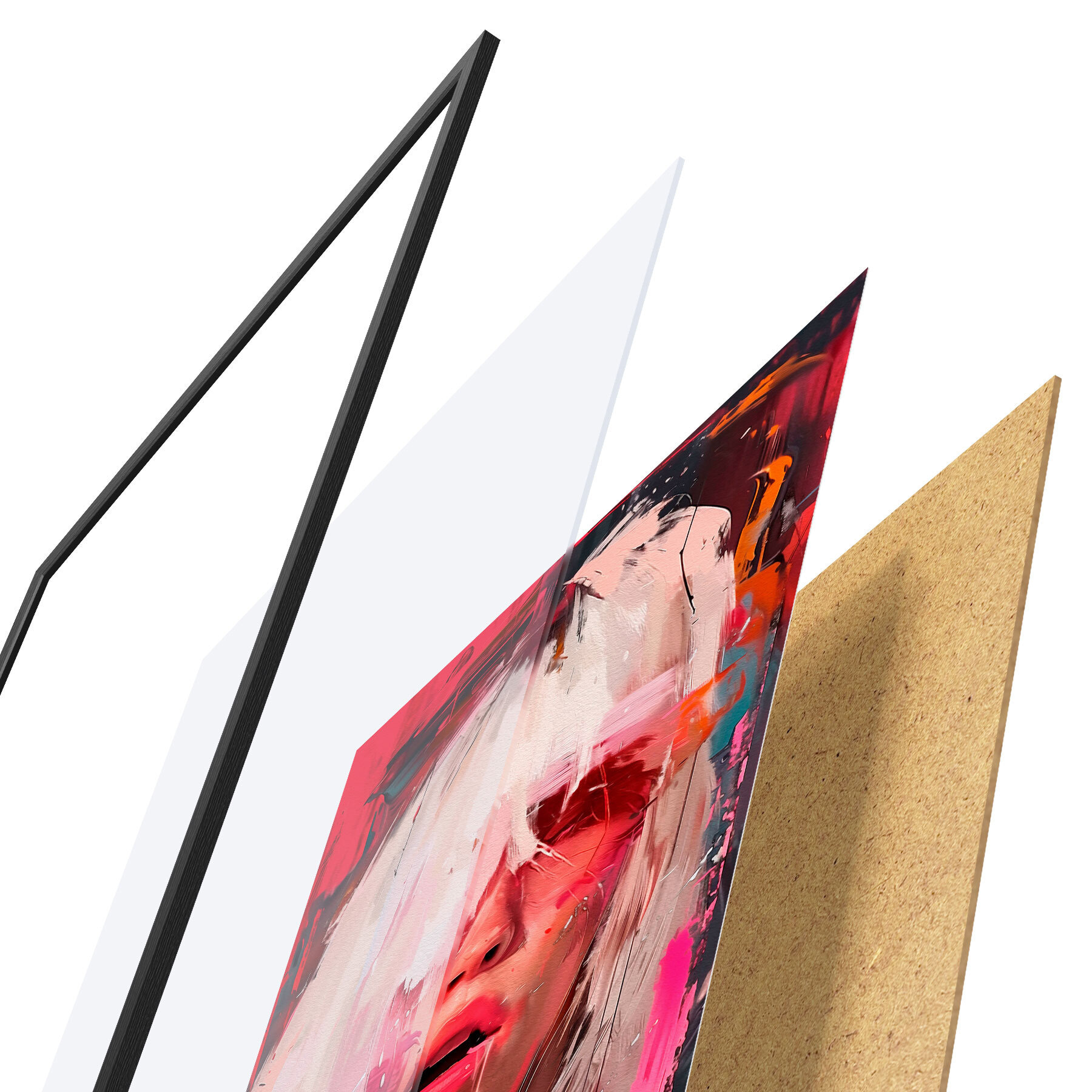 De poster bestaat uit een frame, plexiglas, geprinte afbeelding en spaanplaat achterkant. De poster kan meteen aan de muur worden gehangen dankzij de bevestigingen op de achterkant.