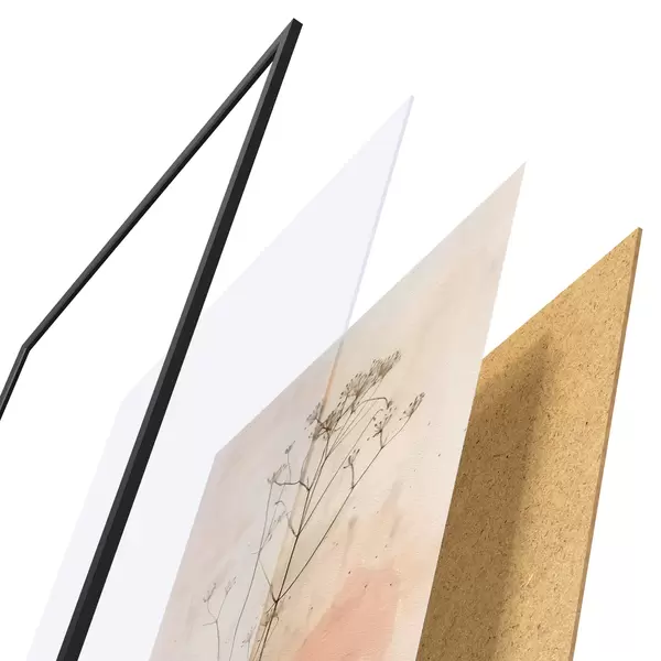 De poster bestaat uit een frame, plexiglas, geprinte afbeelding en spaanplaat achterkant. De poster kan meteen aan de muur worden gehangen dankzij de bevestigingen op de achterkant.