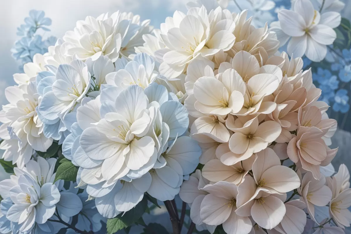 Poster Zachte, pastelkleurige dahliabloemen met delicate bloemblaadjes die bloeien tegen een wazige achtergrond Nr f40146