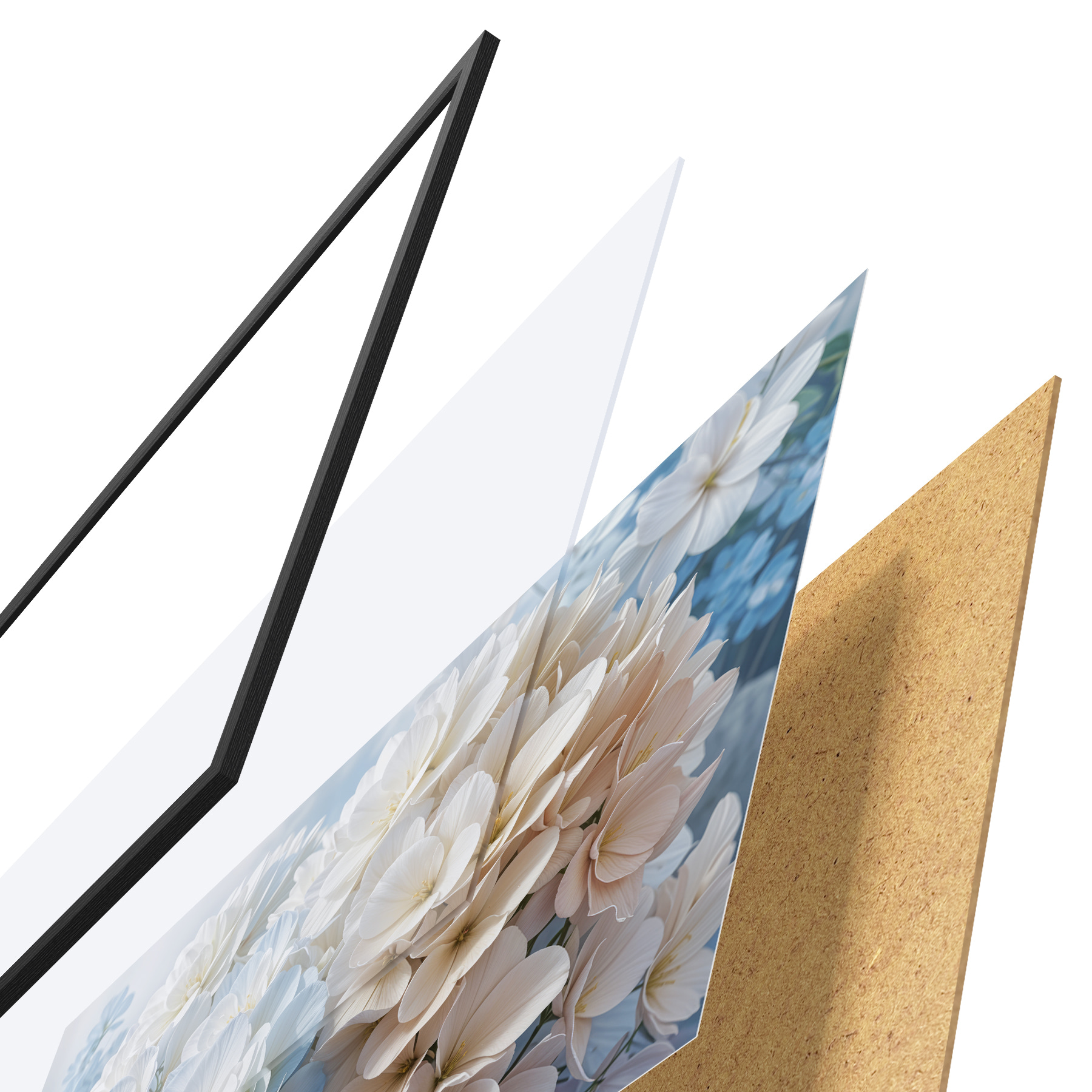 De poster bestaat uit een frame, plexiglas, geprinte afbeelding en spaanplaat achterkant. De poster kan meteen aan de muur worden gehangen dankzij de bevestigingen op de achterkant.