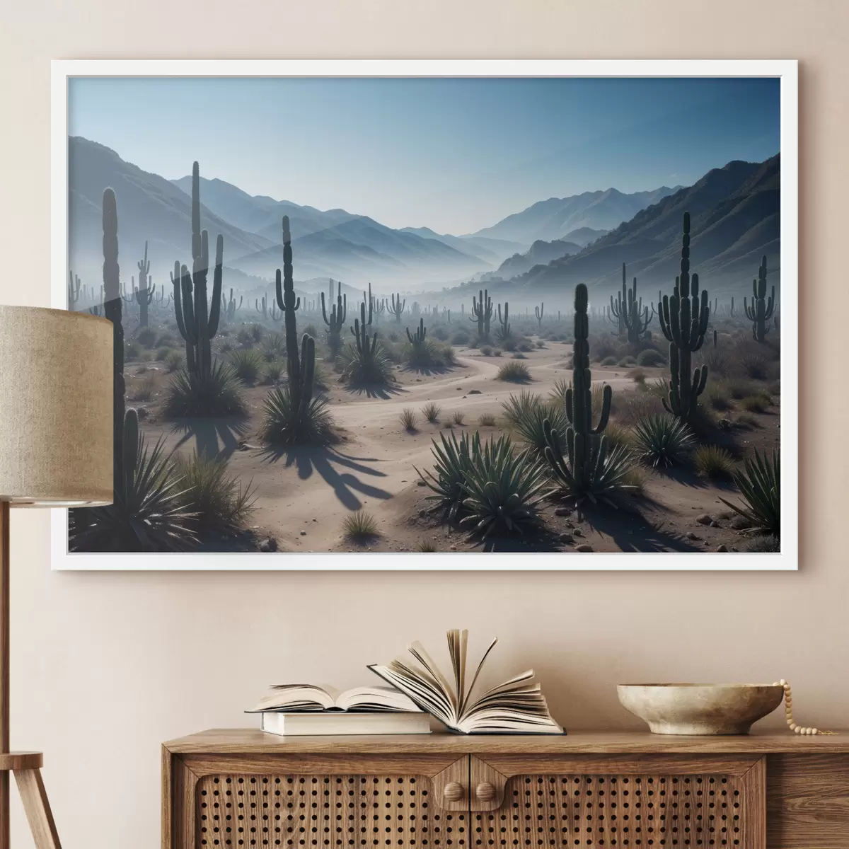 Poster Een woestijnlandschap met hoge cactussen en yuccaplanten op de voorgrond, omgeven door wazige bergen Nr f40153