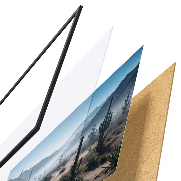 De poster bestaat uit een frame, plexiglas, geprinte afbeelding en spaanplaat achterkant. De poster kan meteen aan de muur worden gehangen dankzij de bevestigingen op de achterkant.