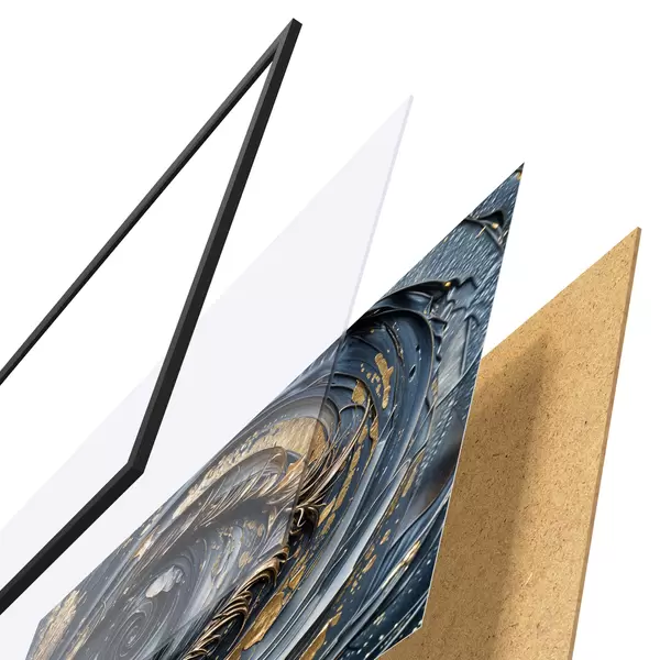 De poster bestaat uit een frame, plexiglas, geprinte afbeelding en spaanplaat achterkant. De poster kan meteen aan de muur worden gehangen dankzij de bevestigingen op de achterkant.