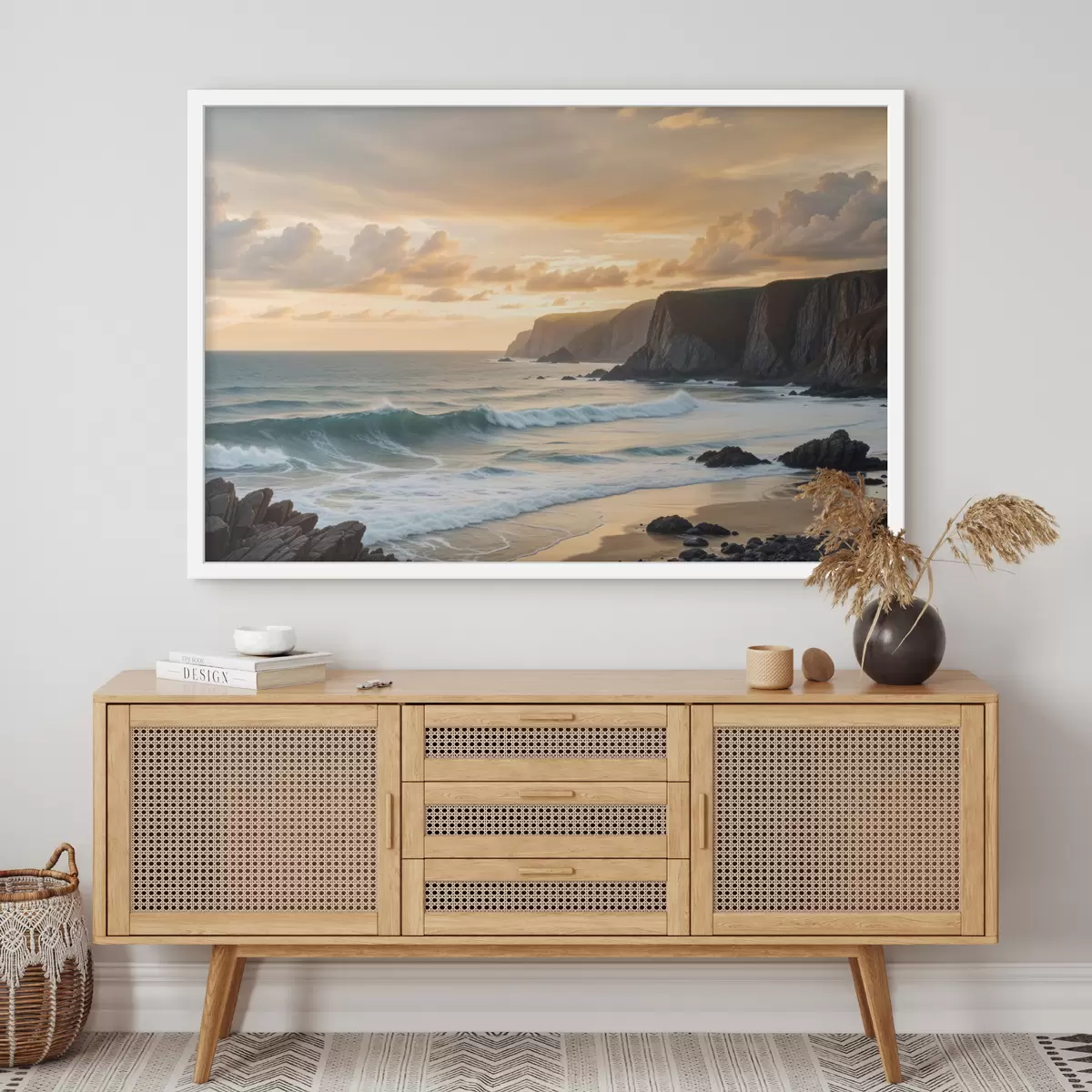 Poster Een schilderachtig kustlandschap met dramatische kliffen, beukende golven en een kleurrijke zonsonderganghemel Nr f40176