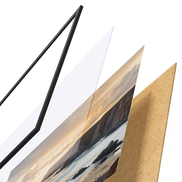De poster bestaat uit een frame, plexiglas, geprinte afbeelding en spaanplaat achterkant. De poster kan meteen aan de muur worden gehangen dankzij de bevestigingen op de achterkant.