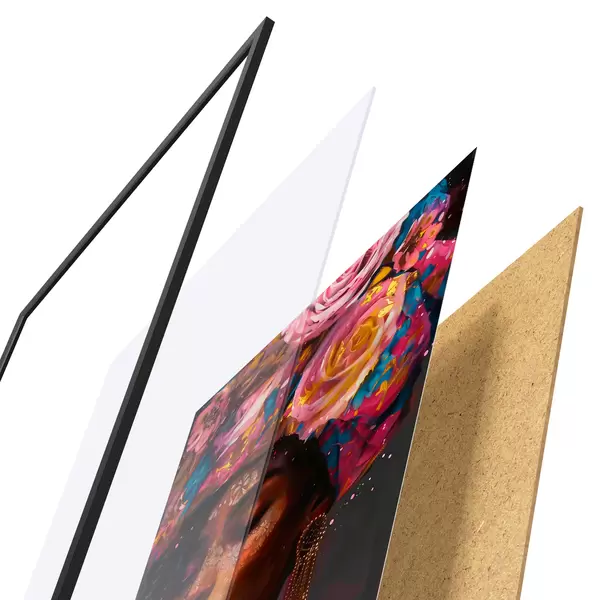 De poster bestaat uit een frame, plexiglas, geprinte afbeelding en spaanplaat achterkant. De poster kan meteen aan de muur worden gehangen dankzij de bevestigingen op de achterkant.