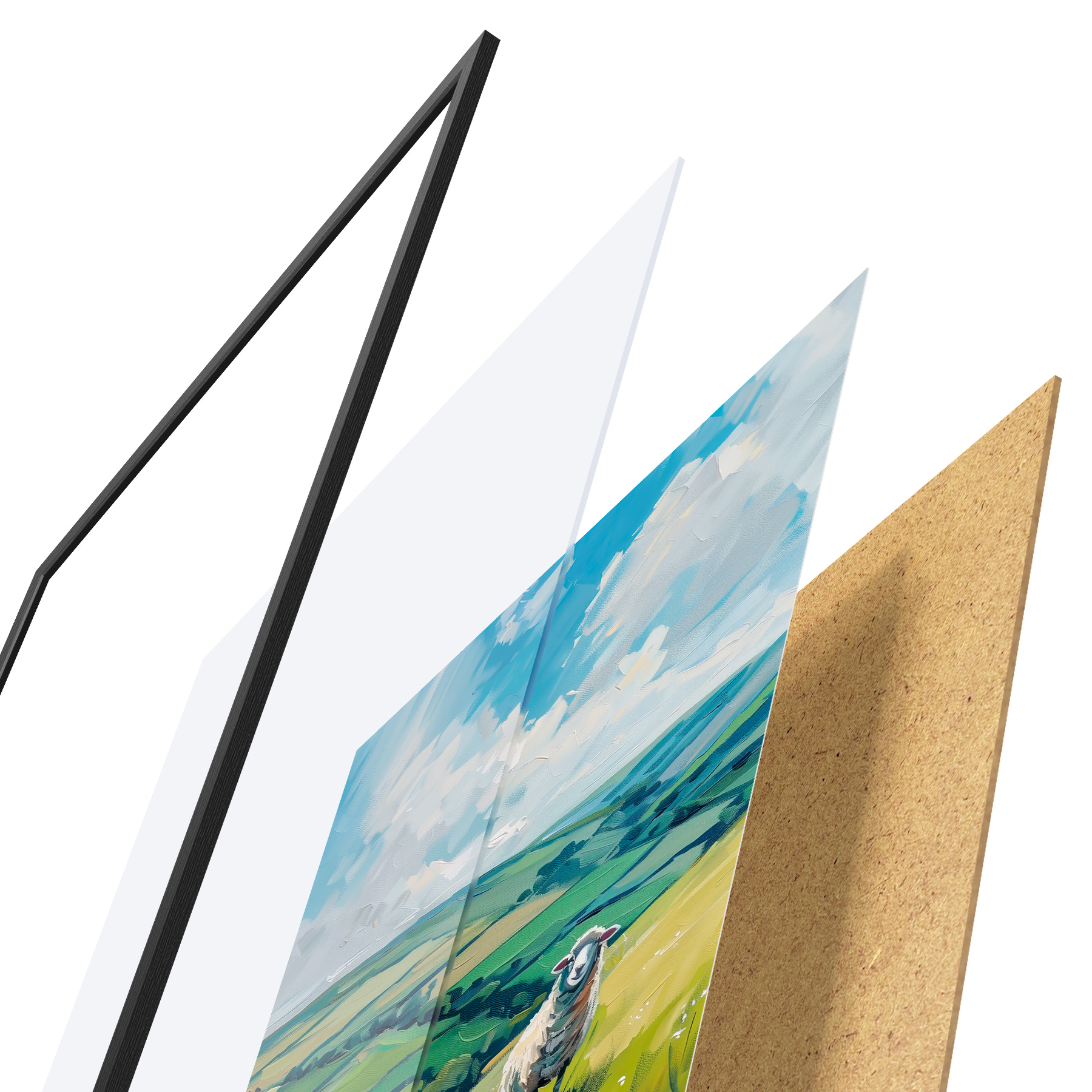 De poster bestaat uit een frame, plexiglas, geprinte afbeelding en spaanplaat achterkant. De poster kan meteen aan de muur worden gehangen dankzij de bevestigingen op de achterkant.
