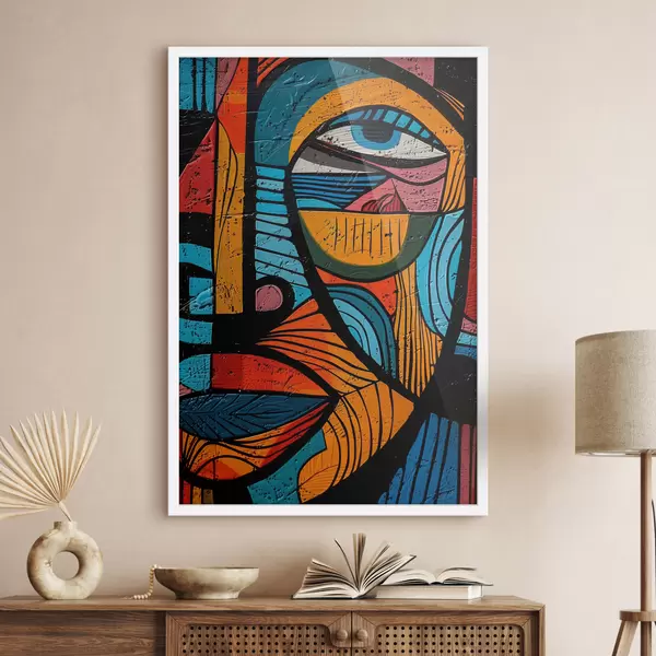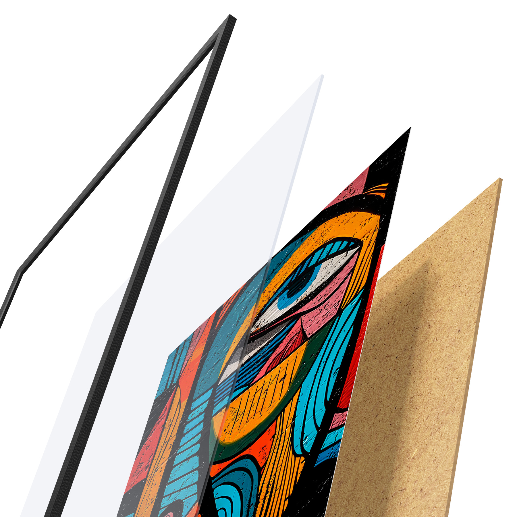 De poster bestaat uit een frame, plexiglas, geprinte afbeelding en spaanplaat achterkant. De poster kan meteen aan de muur worden gehangen dankzij de bevestigingen op de achterkant.