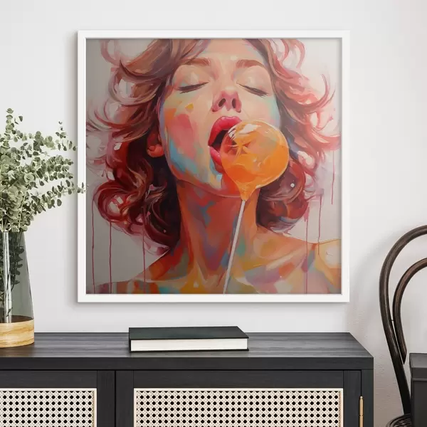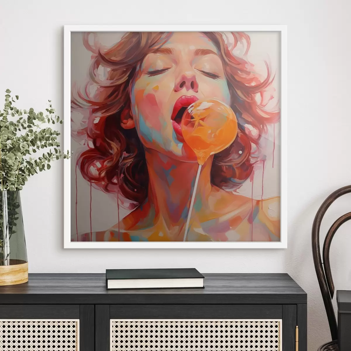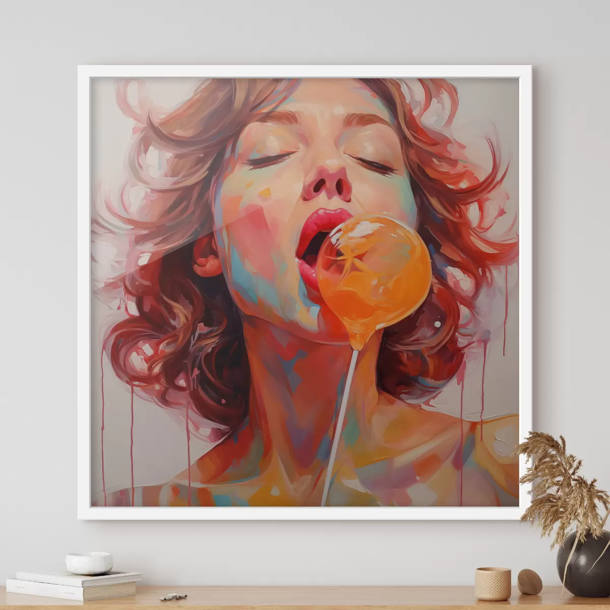 Poster Een meisje met krullend haar in lichte kleuren likt aan een lolly Nr f40213