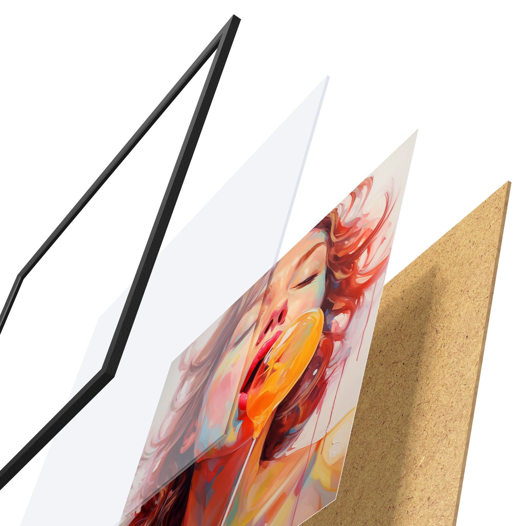 De poster bestaat uit een frame, plexiglas, geprinte afbeelding en spaanplaat achterkant. De poster kan meteen aan de muur worden gehangen dankzij de bevestigingen op de achterkant.