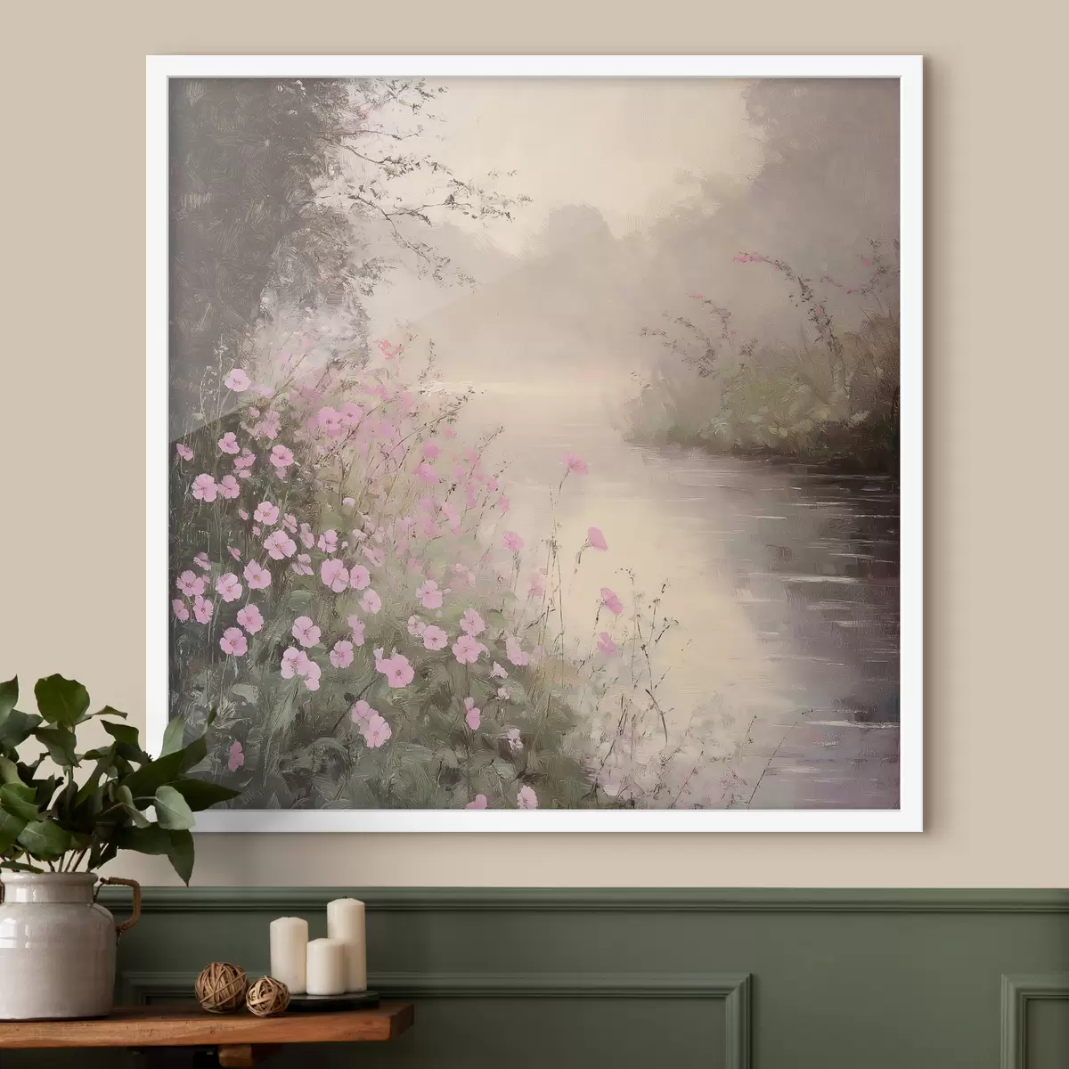 Poster Meer met roze bloemen, zonsopgang, olieverftekening, pastelbeige kleuren, mist Nr f40229