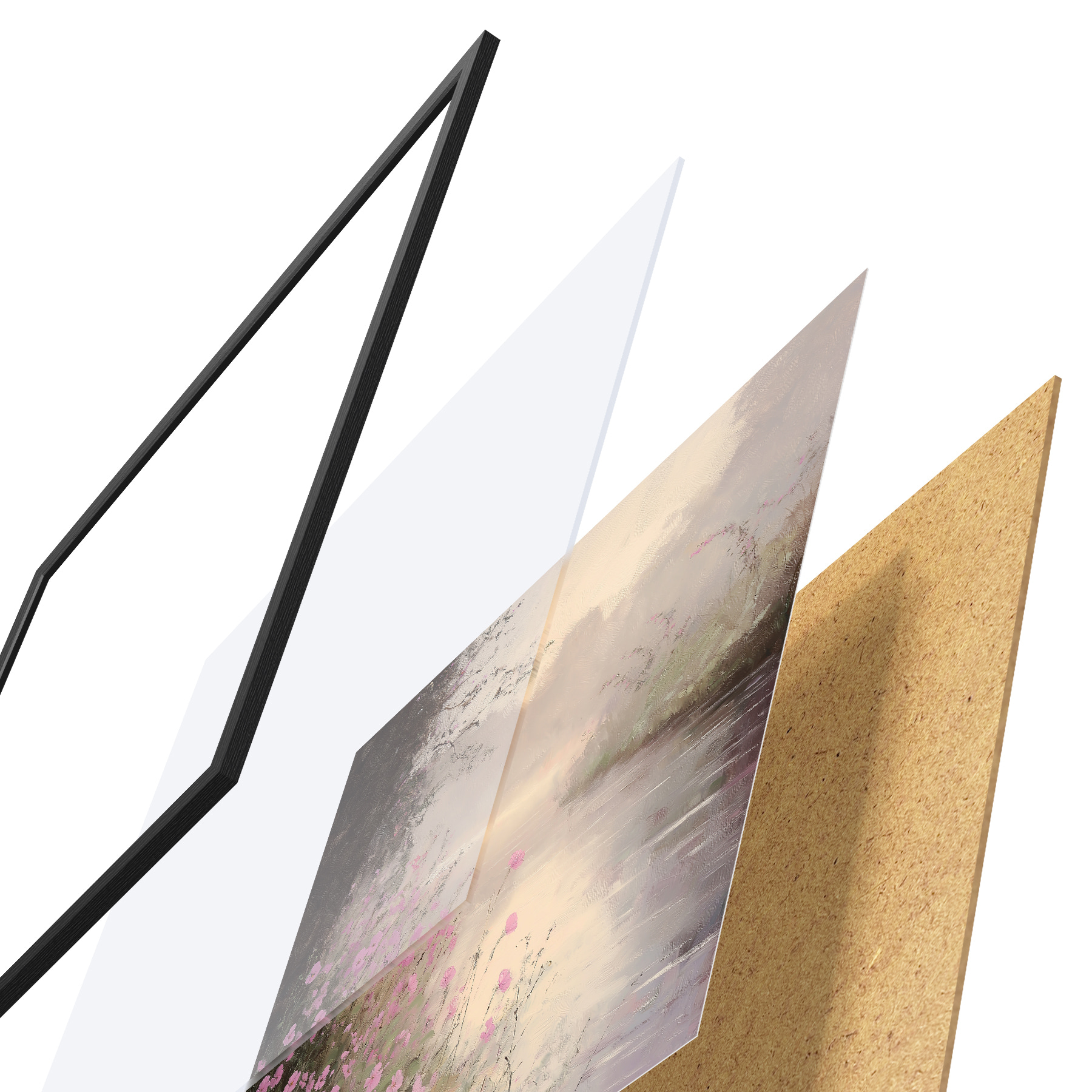 De poster bestaat uit een frame, plexiglas, geprinte afbeelding en spaanplaat achterkant. De poster kan meteen aan de muur worden gehangen dankzij de bevestigingen op de achterkant.