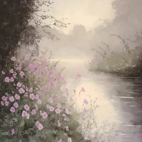 Poster Meer met roze bloemen, zonsopgang, olieverftekening, pastelbeige kleuren, mist Nr f40229