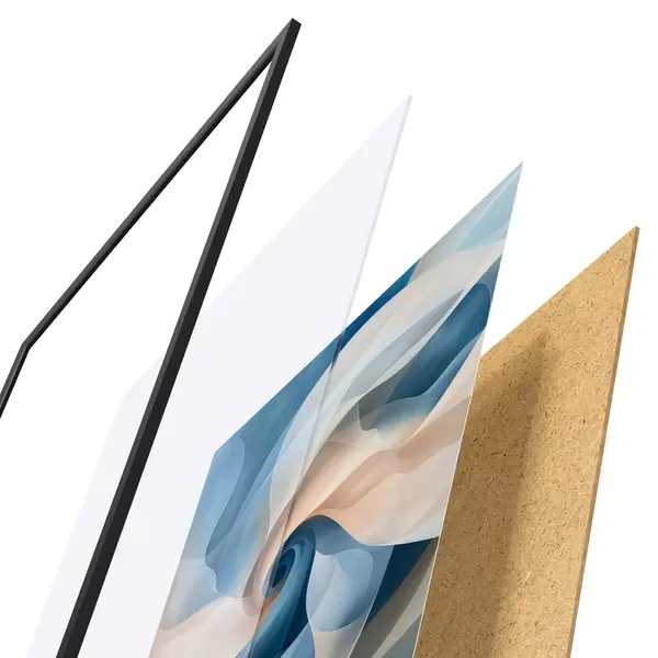 De poster bestaat uit een frame, plexiglas, geprinte afbeelding en spaanplaat achterkant. De poster kan meteen aan de muur worden gehangen dankzij de bevestigingen op de achterkant.