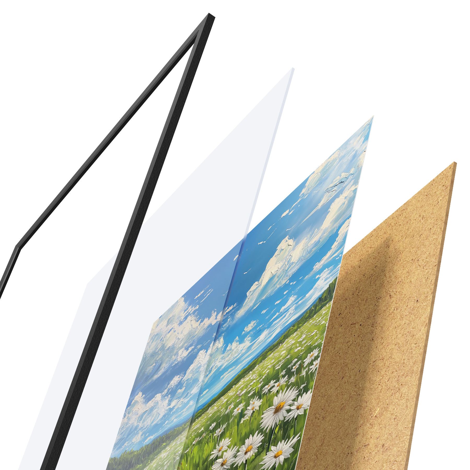 De poster bestaat uit een frame, plexiglas, geprinte afbeelding en spaanplaat achterkant. De poster kan meteen aan de muur worden gehangen dankzij de bevestigingen op de achterkant.