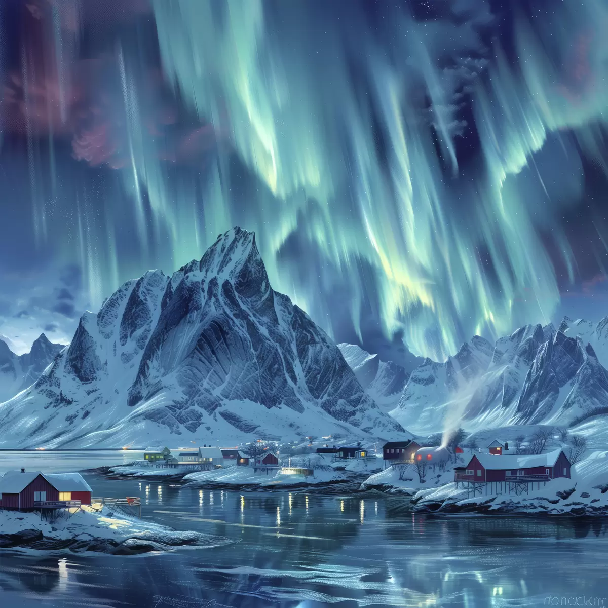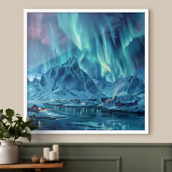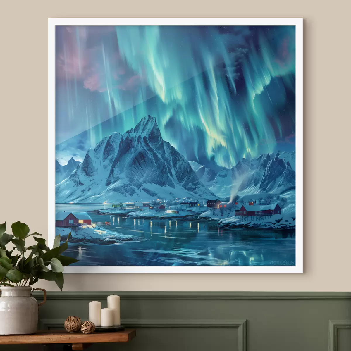 Poster Magisch noorderlicht, winterdorp in Noorwegen Nr f40301