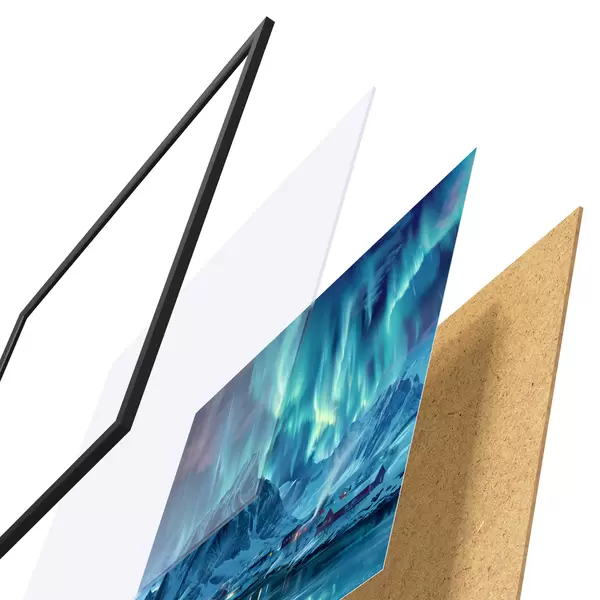 De poster bestaat uit een frame, plexiglas, geprinte afbeelding en spaanplaat achterkant. De poster kan meteen aan de muur worden gehangen dankzij de bevestigingen op de achterkant.