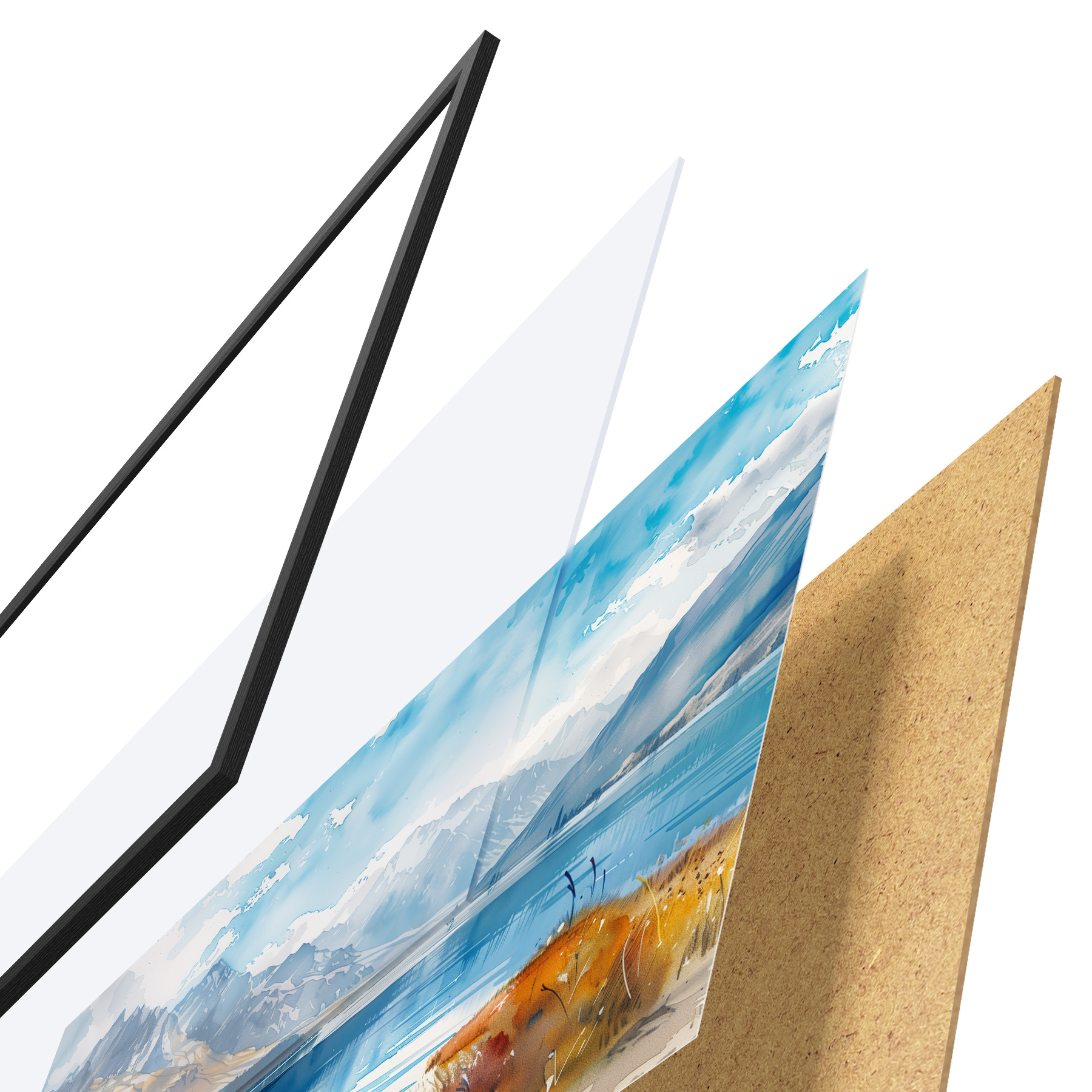 De poster bestaat uit een frame, plexiglas, geprinte afbeelding en spaanplaat achterkant. De poster kan meteen aan de muur worden gehangen dankzij de bevestigingen op de achterkant.