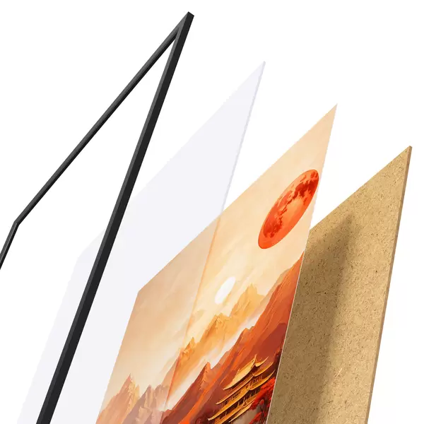 De poster bestaat uit een frame, plexiglas, geprinte afbeelding en spaanplaat achterkant. De poster kan meteen aan de muur worden gehangen dankzij de bevestigingen op de achterkant.