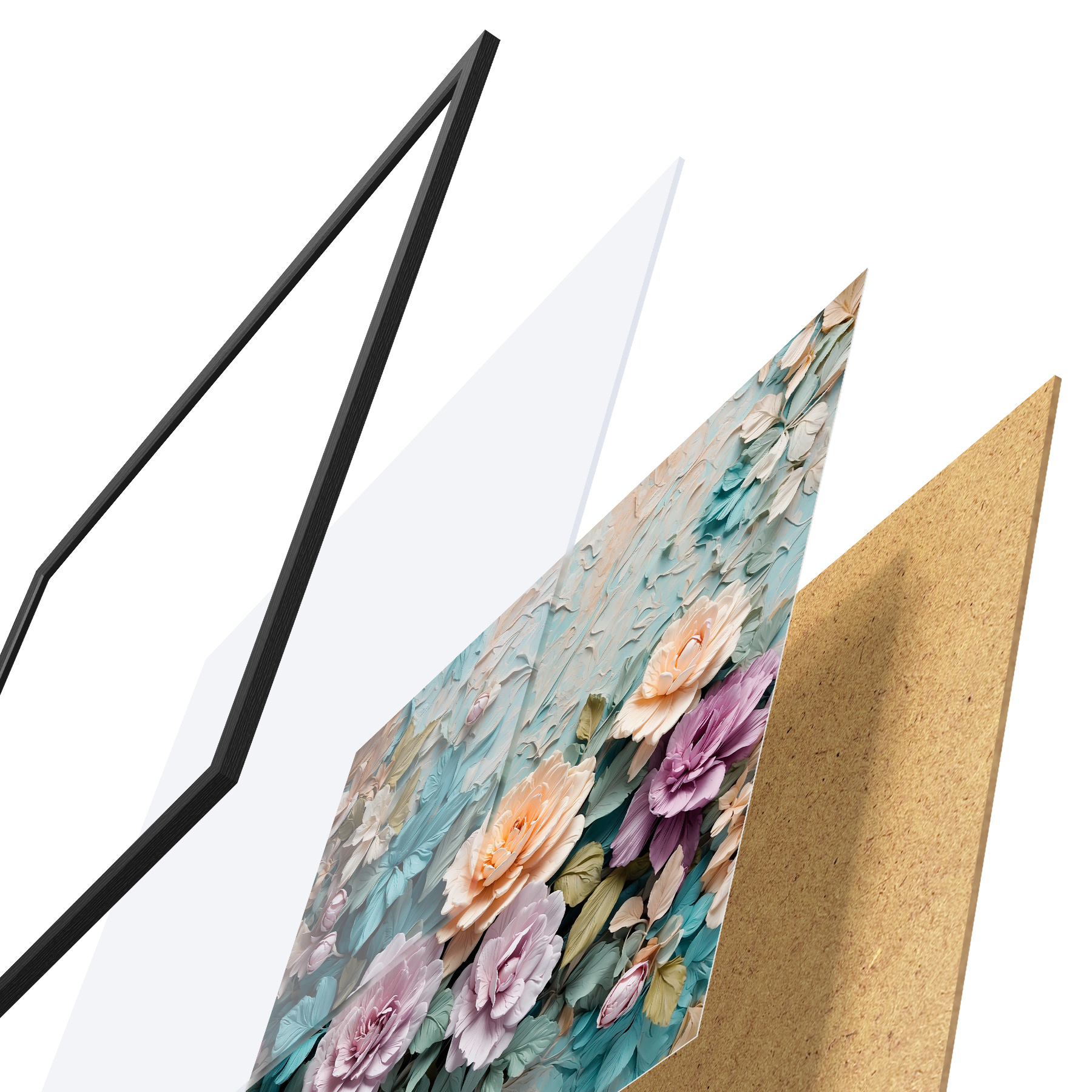 De poster bestaat uit een frame, plexiglas, geprinte afbeelding en spaanplaat achterkant. De poster kan meteen aan de muur worden gehangen dankzij de bevestigingen op de achterkant.