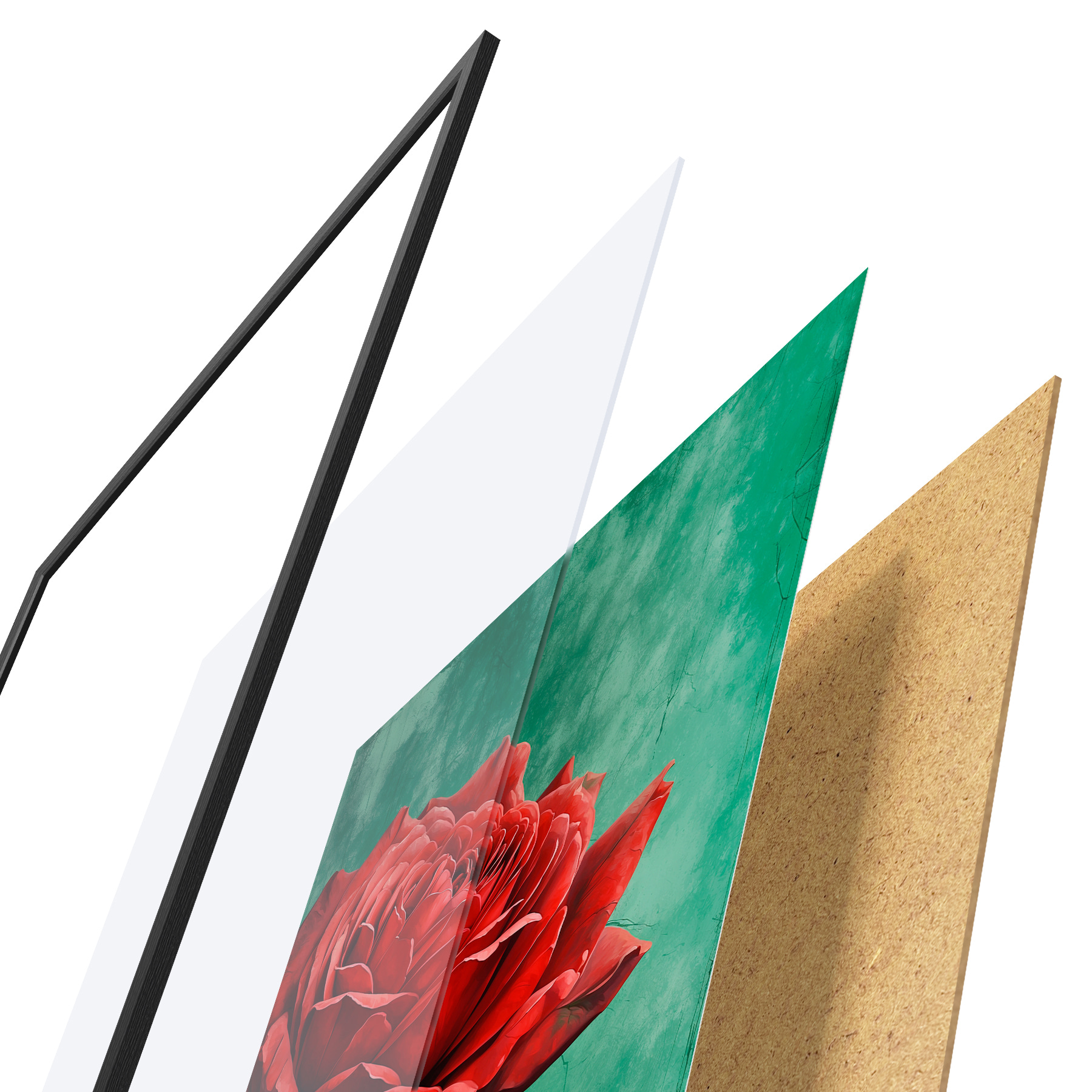 De poster bestaat uit een frame, plexiglas, geprinte afbeelding en spaanplaat achterkant. De poster kan meteen aan de muur worden gehangen dankzij de bevestigingen op de achterkant.