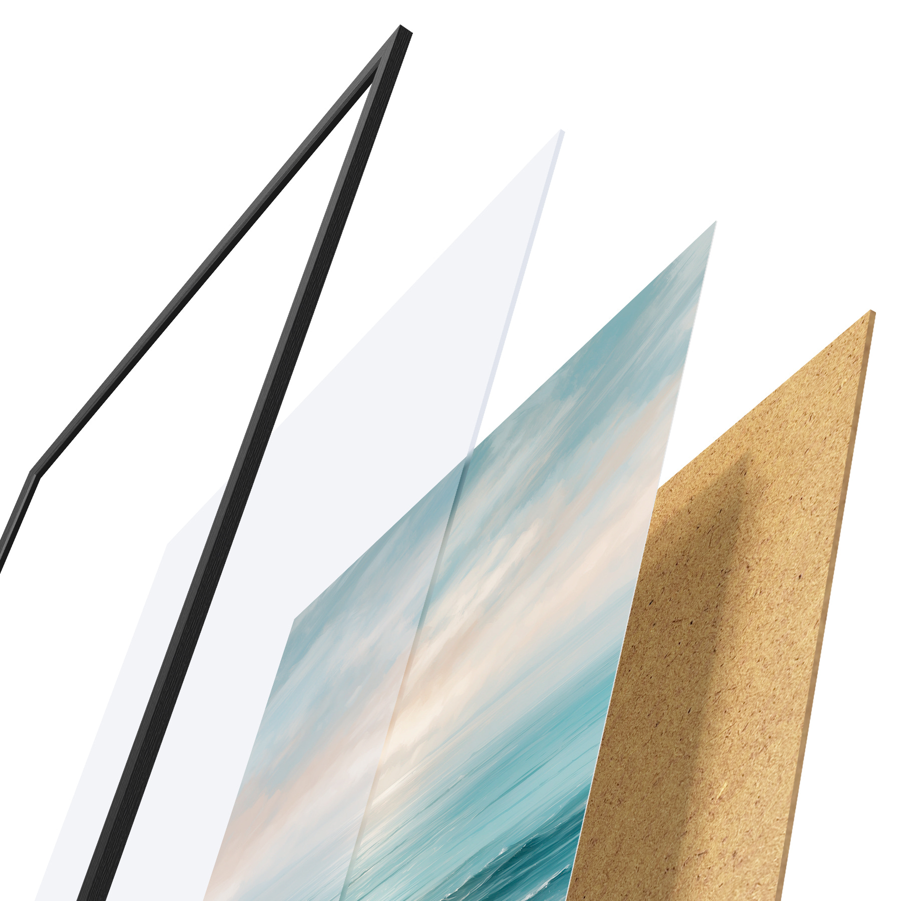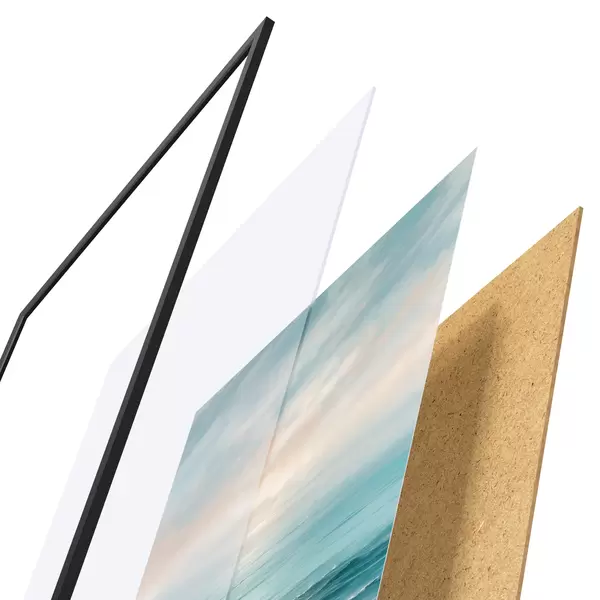 De poster bestaat uit een frame, plexiglas, geprinte afbeelding en spaanplaat achterkant. De poster kan meteen aan de muur worden gehangen dankzij de bevestigingen op de achterkant.